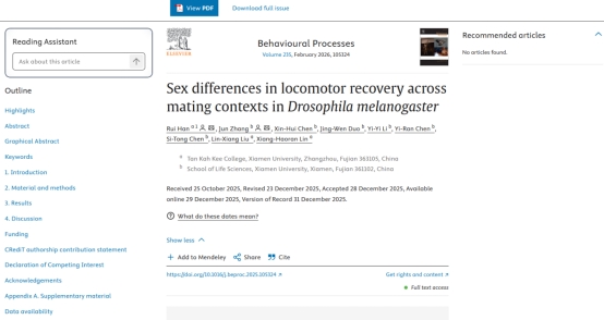 近日,我院智能科学与技术专业2023级本科生刘林翔、林祥浩然,在校通识教育中心副教授韩睿老师的指导下,与厦门大学生命科学学院团队合作,成功在国际期刊Behavioural Processes(中科院SCI4区)上发表有关果蝇行为学的研究论文。